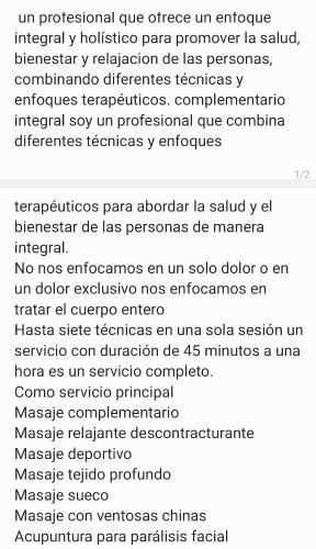 Excelente servicio, altamente recomendable. Puntualidad, profesionalidad y calidad en cuanto al masaje/terapia solicitados.